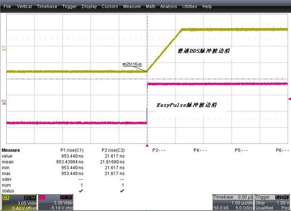 如图1,输出1KHz频率脉冲时,EasyPulse脉冲仍然可以保持快速的上升沿和下降沿(约20ns),而普通的DDS脉冲边沿很缓慢。